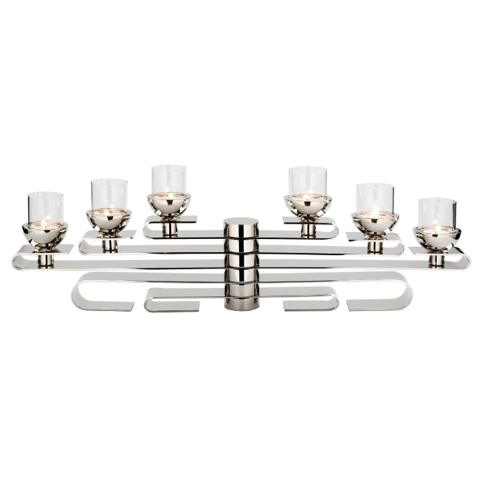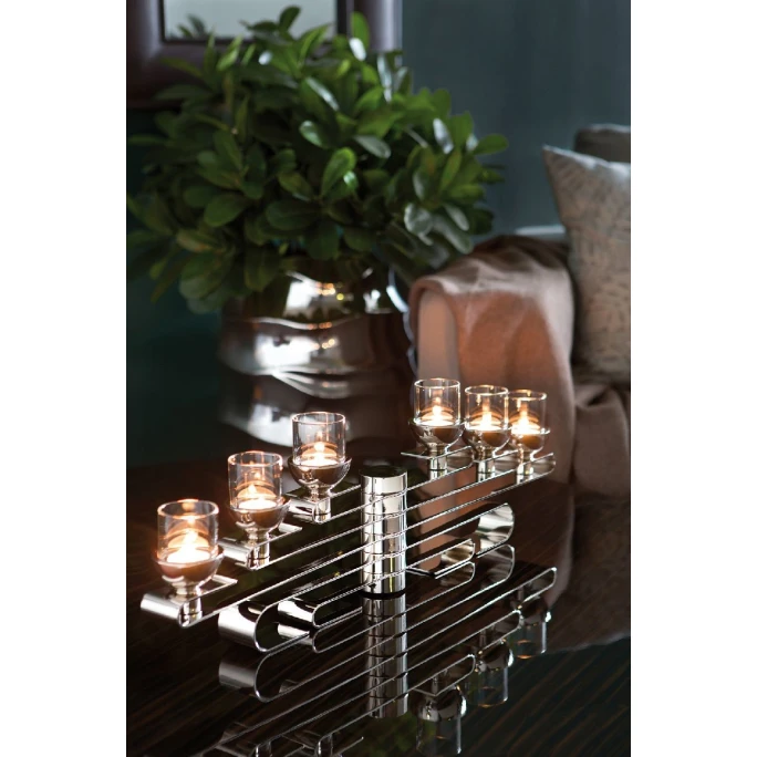 Lassen Sie sich beeindrucken von dem 6-flammigen Leuchter KANDELO aus dem Hause Fink! Seine geschwungenen Formen, die hochwertig vernickelte Oberfläche und die raffinierten Details machen dieses Prachtstück zu einem wahren Hingucker. Die Mittelachse des Windlichtes KANDELO von Fink ist drehbar, so lassen sich immer wieder neue Anordnungen der Teelichter und Kerzen erzeugen. Ob Sternenform oder gradlinige Formation, Sie haben die Wahl. Besonders die erstklassige Verarbeitung, das pflegeleichte, vernickelte Metall und das außergewöhnliche Design lassen keine Wünsche offen. Kleine, im Lieferumfang enthaltene, Glaszylinder schützen die Flamme und durch das hohe Eigengewicht des Leuchters KANDELO von Fink ist er sehr standfest und sicher. Dieses extravagante Windlicht ist sowohl für Teelichter als auch Titankerzen geeignet. Der glänzende Leuchter KANDELO aus dem Hause Fink wird Ihre Herz im Nu erobern!