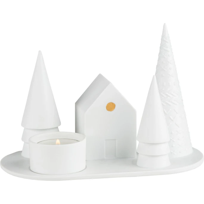 Mit dem LIVING Waldhütte Teelichthalter von räder bringen Sie garantiert weihnachtliches Flair in Ihr Zuhause. Aus teilglasiertem Porzellan handgefertigt, besteht Waldhütte aus einem ovalen Teller mit kleinen Haus, drei stilisierten Tannenbäumen und einem Teelichthalter. Der kleine, goldfarbene Punkt auf der Hausfront rundet das optische Gesamtbild dabei perfekt ab. Lassen Sie sich begeistern, läuten die Weihnachtszeit ein und machen sich oder einem lieben Menschen mit dem LIVING Waldhütte Teelichthalter von räder eine besonders schöne und ausgefallene Freude!